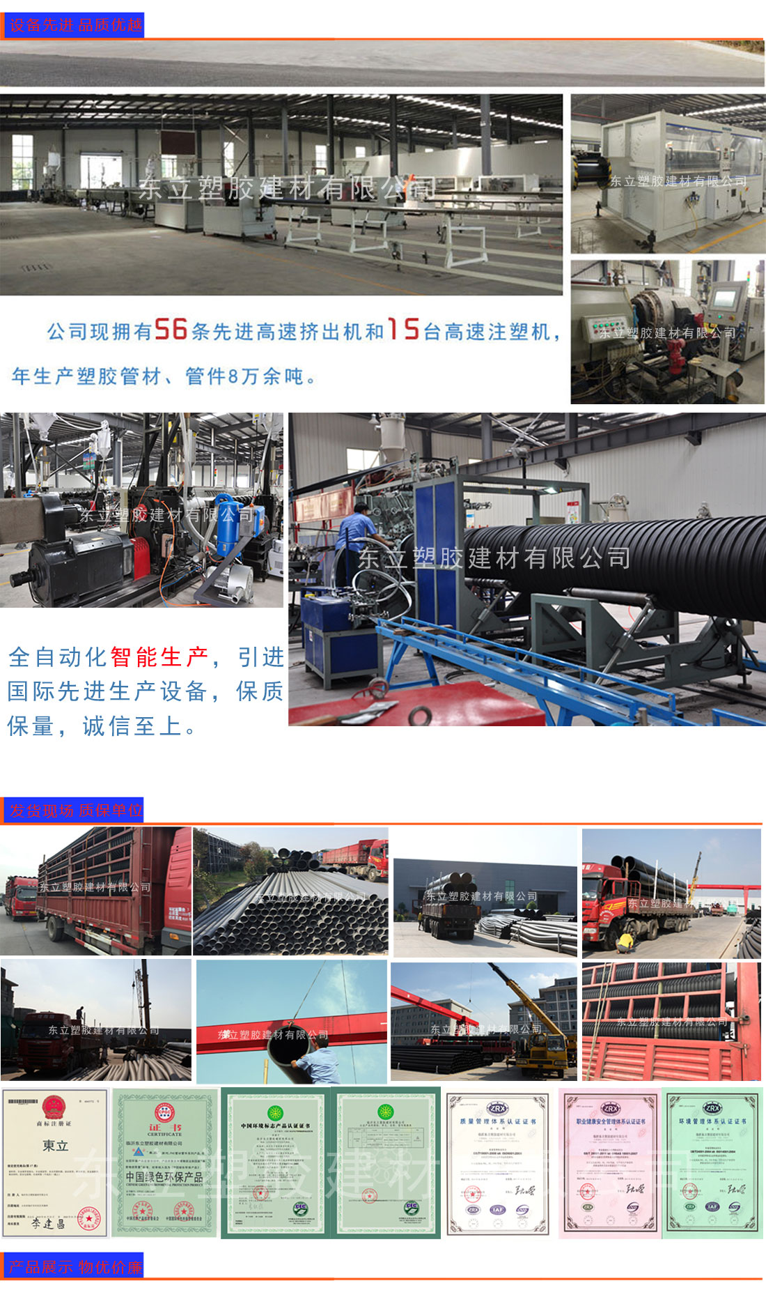 主要生產(chǎn)“東立”品牌塑膠管道,主要產(chǎn)品包括五大系列十六種產(chǎn)品,規(guī)格齊全,產(chǎn)能龐大、供貨及時(shí),設(shè)備先進(jìn)、質(zhì)量穩(wěn)定,服務(wù)優(yōu)良、滿足客戶的需求。